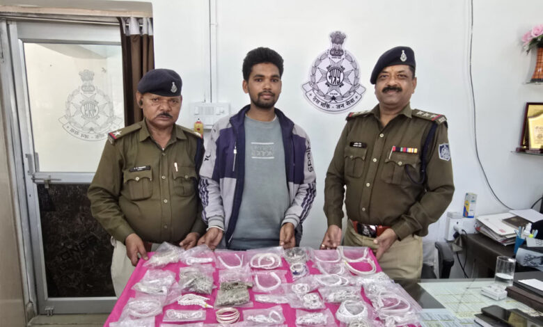 श्रीमान पुलिस अधीक्षक महोदय अनूपपुर श्री मोती उर रहमान जी के निर्देशन में कोतवाली निरीक्षक अरविंद जैन के नेतृत्व में उपनिरीक्षक प्रवीण साहू, प्रधान आरक्षक महेंद्र सिंह, शेख रशीद, रितेश सिंह, महिला आरक्षक अंकिता सोनी और आरक्षक अब्दुल की टीम ने मामले की जांच करते हुए मुख्य आरोपी सोनू सिंह (उम्र 21 वर्ष), निवासी ग्राम छपराटोला, ग्राम लखनपुर, थाना कोतवाली, अनूपपुर को गिरफ्तार किया गया। चोरी के जेवरात खरीदने में शामिल राजेश सोनी (उम्र 48 वर्ष), निवासी वार्ड नंबर 15, सोनी मोहल्ला, पुरानी बस्ती, अनूपपुर, और उसकी पत्नी सुधा सोनी (उम्र 45 वर्ष) को भी गिरफ्तार किया गया। पुलिस ने आरोपियों के कब्जे से 03 लाख रुपए मूल्य के सोने-चांदी के जेवरात बरामद किए, जिनमें पायल, पाजेब, करधन, हाथ की मेहंदी, बच्चों के हाथ और पैर के चूड़े, गले की चेन, ब्रेसलेट, बड़ों के कंगन और चूड़े, और सोने के कान के 5 जोड़ी टॉप्स शामिल हैं।