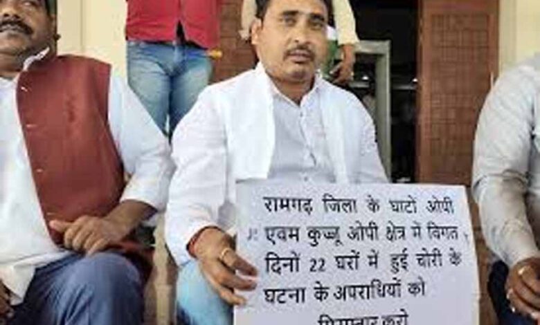 वहीं मांडू से आजसू के विधायक प्रवेश द्वार भी हाथ में पोस्टर पकड़ धरने पर बैठे हैं। पोस्टर में लिखा है, "रामगढ़ जिला के घाटों ओपी एवम कुज्जू ओपी क्षेत्र में विगत दिनों 22 घरों में हुई चोरी के घटना के अपराधियों को गिरफ्तार करो।"