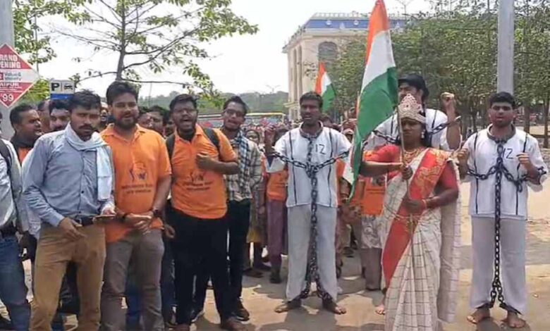 BEd सहायक शिक्षकों की अनिश्चितकालीन हड़ताल जारी, भगत सिंह, राजगुरु और सुखदेव की वेशभूषा में निकाली रैली