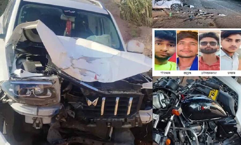 बीकानेर के नाल थाना क्षेत्र में एक भीषण सड़क हादसे में चार युवकों की जान चली गई। घटना शनिवार देर रात राष्ट्रीय राजमार्ग NH-11 (जैसलमेर रोड) पर हुई, जब एक तेज रफ्तार स्कॉर्पियो ने दो बाइकों को पीछे से टक्कर मार दी। इस दुर्घटना में तीन युवकों की मौके पर ही मौत हो गई, जबकि चौथे युवक ने अस्पताल में इलाज के दौरान दम तोड़ दिया।