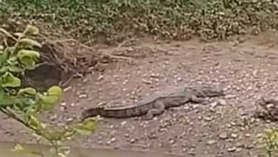 नाले से बाहर निकलकर खेतों में टहलते हुए दिखा छह फीट लंबा मगरमच्छ