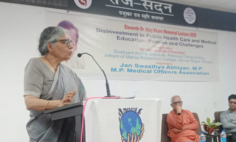 आज डॉ अजय खरे स्मृति व्याख्यान माला की ग्यारहवीं कड़ी मे मुख्य वक्ता के रूप में प्रोफेसर(डॉ.) रमा वी बारु, जवाहरलाल नेहरू विश्वविद्यालय के सामाजिक चिकित्सा और सामुदायिक स्वास्थ्य केंद्र की सेवानिवृत्त प्रोफेसर उपस्थित थी। प्रोफेसर(डॉ.) रमा वी बारु, ने “सार्वजनिक स्वास्थ्य देखभाल और चिकित्सा शिक्षा में विनिवेश: नीतियां और चुनौतियां ” विषय पर अपने विचार प्रस्तुत करते हुये कहा कि वैश्विक परामर्श समूहों की सलाह के आधार पर 2022 के नीति आयोग के दस्तावेज़ में जिला अस्पतालों को मेडिकल कॉलेज स्थापित करने वाले निजी हितधारकों को सौंपने का दिशानिर्देश दिये गए है। जिसके आधार पर स्वास्थ्य सेवाओं और चिकित्सा शिक्षा में पीपीपी के माध्यम से व्यावसायीकरण से निजीकरण का गंभीर प्रयास किया जा रहा है। जिला अस्पतालों और सीएचसी को निजी मेडिकल कॉलेजों के साथ साझेदारी के लिए सौंपने का प्रस्ताव एक अच्छी तरह से काम करने वाली सार्वजनिक स्वास्थ्य प्रणाली के लिए आवश्यक रेफरल प्रणाली को तोड़ देगा।