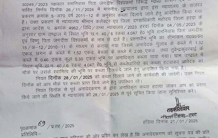 मध्य प्रदेश मे ही नही बल्कि समूचे भारत मे राजस्व संबंधित जमीन – जायदाद या प्रॉपर्टी वाले मामले पूर्णतया लंबित चलते रहते हैं। लेकिन मामला अगर न्यायालय तक पहुंच जाए और न्यायालय संबंधित अधिकारी को आदेश कर दें तो पूर्ण रूप से यह माना जाता है कि उसका निराकरण सभवतः हो गया है । लेकिन मध्य प्रदेश के हरदा जिले का एक ऐसा ही मामला प्रकाश में आया है। जहां पर जबलपुर उच्च न्यायालय ने प्रशासनिक अधिकारियों को 10 एकड़ पर फरियादी को कब्जा दिलाने की बात कही है, परंतु उक्त मामले मे देरी हो रही है । हरदा जिले के तहत तहसील हंडिया मे ग्राम उन्ढाल के किसान रामनिवास पिता जगदीश विश्वकर्मा के द्वारा उच्च न्यायालय जबलपुर मे रिट पिटीशन दायर की थी । कोर्ट ने रामनिवास को कब्जा दिलाने के लिए संबंधितों को आदेश किया था , जिसकी तारीख 28 जनवरी थी। लेकिन अभी तक वहाँ कोई प्रशासनिक अधिकारी नही पहुँचा । उस जमीन पर तीन लोगों का कब्जा बताया जा रहा है । जानकारी के मुताबिक आवेदक पूर्व मंत्री का गरीबी बताया जा रहा है।