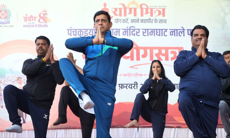 देश के सबसे स्वच्छ शहर इंदौर के सार्थक प्रयासों द्वारा शहर के नालों को इतना स्वच्छ बना दिया गया है कि अब उनमें विभिन्न प्रकार के आयोजन किए जा सकते हैं।इसी क्रम में महापौर श्री पुष्यमित्र भार्गव एवं प्रदेश के अन्य महापौरों के साथ पंचकुइयाँ स्थित श्रीराम मंदिर रामघाट पर सूखे नाले में योगमित्र अभियान के अंतर्गत योग सत्र प्रारंभ हुआ।इस अवसर पर सिंगरौली की महापौर श्रीमती रानी अग्रवाल जी संत श्री रामगोपाल महाराज जी एमआईसी सदस्य अश्विनी शुक्ल स्थानीय पार्षद संध्या यादव पार्षद भारत रघुवंशी महापौर प्रतिनिधि शैलू देव सहित बड़ी संख्या में योग मित्र सम्मिलित हुए