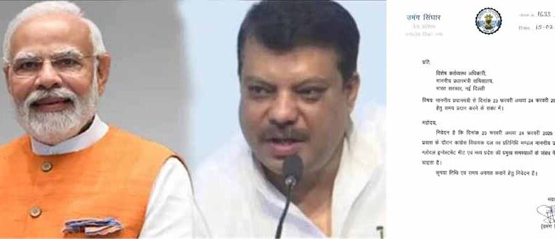 मध्यप्रदेश के नेता प्रतिपक्ष उमंग सिंघार ने प्रधानमंत्री नरेन्द्र मोदी से मिलने और प्रदेश की समस्याओं से उन्हें अवगत कराने के लिए पत्र लिखकर समय मांगा है। पीएम मोदी 23 और 24 फरवरी को भोपाल के दौरे पर आ रहे हैं। इसी को लेकर नेता प्रतिपक्ष ने पत्र लिखकर कहा है कि कांग्रेस विधायकों का प्रतिनिधिमंडल उनसे भेंट करना चाहता है।