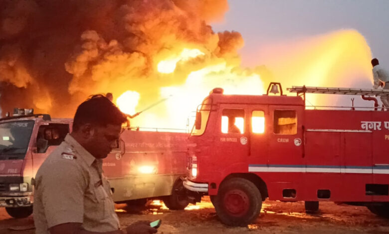 मंदसौर में भीषण आग, आसपास के गांवों में अलर्ट, जल जीवन मिशन के पाइप खाक