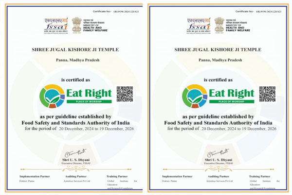 भारत सरकार के स्वास्थ्य एवं परिवार कल्याण मंत्रालय के अंतर्गत भारतीय खाद्य सुरक्षा एवं मानक प्राधिकरण (FSSAI), नई दिल्ली द्वारा पन्ना के जुगल किशोर मंदिर को ‘ईट राइट भोग स्थल’ प्रमाण पत्र प्रदान किया गया है। यह प्रमाणन मंदिर परिसर के प्रसाद और खाद्य सामग्री की गुणवत्ता, स्वच्छता और सुरक्षा सुनिश्चित करने के लिए प्रदान किया गया है।