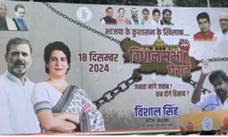 भाजपा के कुशासन के खिलाफ कांग्रेस पार्टी ने बुधवार को उत्तर प्रदेश विधानसभा का घेराव करने का निर्णय लिया है। यह जानकारी उत्तर प्रदेश (पूर्वी) युवा कांग्रेस के प्रदेश अध्यक्ष विशाल सिंह द्वारा लगाए गए पोस्टर से मिली है। लखनऊ में कांग्रेस कार्यालय के बाहर विधानसभा घेराव से संबंधित पोस्टर्स लगाए गए हैं। कांग्रेस की ओर से लगाए गए पोस्टर में प्रमुख रूप से लिखा गया है, “जनता मांगे जवाब! कब दोगे हिसाब?” और “18 दिसंबर लखनऊ चलो”। कांग्रेस के इस अभियान को योगी सरकार के खिलाफ विरोध का एक बड़ा कदम माना जा रहा है। कांग्रेस का कहना है कि भाजपा सरकार ने पिछले कुछ साल में प्रदेश कानून-व्यवस्था की स्थिति को बिगाड़ दिया है, जनता को समय पर मूलभूत सुविधाएं नहीं मिल रही है। कांग्रेस का मानना है कि योगी सरकार के कुप्रबंधन से प्रदेश की जनता परेशान है और अब समय आ गया है कि सरकार से इसका जवाब लिया जाए।