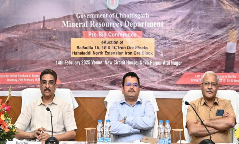 संचालनालय भौमिकी एवं खनिकर्म, छत्तीसगढ़ द्वारा बस्तर के बैलाडीला क्षेत्र के लौह अयस्क ब्लॉकों की नीलामी को लेकर आज नवा रायपुर के न्यू सर्किट हाउस स्थित कन्वेंशन हॉल में ‘प्री-बिड कॉन्फ्रेंस’ का आयोजन किया गया। इस बैठक में देशभर से आए खनन निवेशकों और बोलीदाताओं ने भाग लिया, जहां नीलामी प्रक्रिया, निवेश अवसरों, और खनिज संसाधनों पर विस्तृत चर्चा हुई।