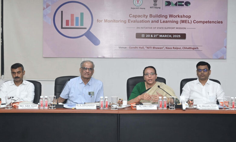 छत्तीसगढ़ में शासन की प्रभावशीलता और योजनाओं की दक्षता को और अधिक सशक्त बनाने के उद्देश्य से राज्य नीति आयोग एवं नीति आयोग (भारत सरकार) के डेवलपमेंट मॉनिटरिंग एंड इवैल्यूएशन ऑफिस (डीएमईओ) के सहयोग से "मॉनिटरिंग एंड इवैल्यूएशन" विषय पर दो दिवसीय कार्यशाला आयोजित की गई। यह दो दिवसीय कार्यशाला 20 और 21 मार्च को आयोजित की जा रही है, जिसमें राज्य सरकार के विभिन्न विभागों के अधिकारियों को आधुनिक निगरानी और मूल्यांकन तकनीकों का प्रशिक्षण दिया जा रहा है।