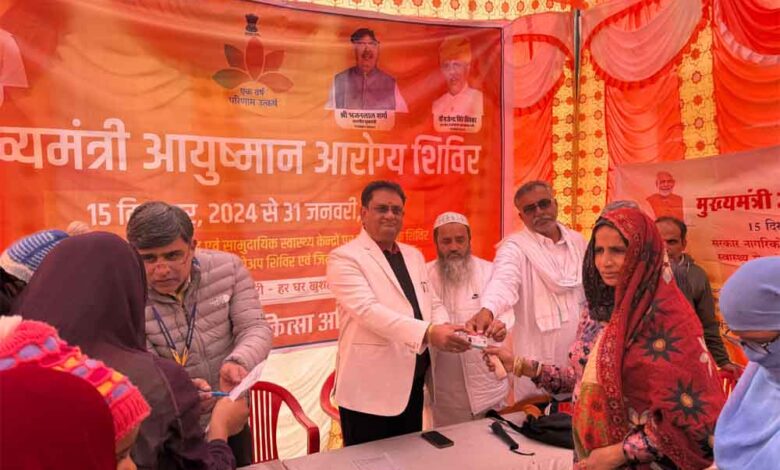 मुख्यमंत्री श्री भजनलाल शर्मा की पहल पर प्रदेशभर में राज्य सरकार की प्रथम वर्षगांठ के अवसर पर शुरू किए गए मुख्यमंत्री आयुष्मान आरोग्य शिविरों का आमजन भरपूर लाभ ले रहे हैं। चिकित्सा मंत्री श्री गजेन्द्र सिंह खींवसर के मार्गदर्शन में 15 दिसम्बर से आयोजित किए जा रहे इन शिविरों में मात्र 5 आयोजन दिवस में अब तक 5 लाख 47 हजार से अधिक लोगों ने भाग लेकर स्वास्थ्य जांच, उपचार एवं परामर्श लिया है।