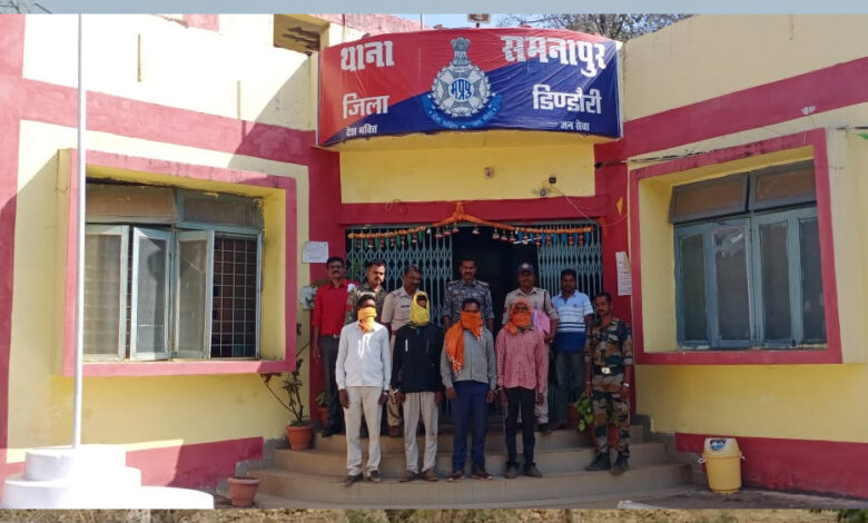 जिले अंतर्गत समनापुर थाना में मुखबिर द्वारा सूचना प्राप्त हुई कि कुछ लोग बांधा तालाब तरफ जाने वाली रास्ता में घुघराई घाट जंगल में जंगली जानवरों का शिकार करने के लिये फांदा, सांग ,कोला लेकर जंगल में गये है , प्राप्त सूचना की तस्दीक हेतु स्वतंत्र गवाहो को लेकर थाना से टीम रवाना हुई जो मुखबिर द्वारा बताये हुए स्थान (जंगल) पर जाकर देखे तो 04 लोग जंगली जानवरो का शिकार करने के लिए नुकीली धारदार हथियार व जाल (फांदा), लाठी /डण्डा रखे हुए थे जो पुलिस को देखकर जंगल में भागने लगे जिन्हे घेराबन्दी कर पकडा गया जिनसे नाम पता पूछने पर अपना नाम (1) धर्मेन्द्र कुमार मरावी पिता महेश कुमार मरावी जाति गोंड उम्र 30 वर्ष , (2) सिकल चंद मरावी पिता स्व0 फूलसिंह मरावी , (3) राजकुमार मरावी पिता स्व0 कूप सिंह मरावी जाति गोंड उम्र 50 वर्ष , (4) अशोक कुमार मरावी पिता स्व0 हीरा सिंह मरावी जाति गोंड उम्र 40 वर्ष सभी निवासी ग्राम खम्हरिया थाना समनापुर जिला डिण्डौरी के होना बताये ।