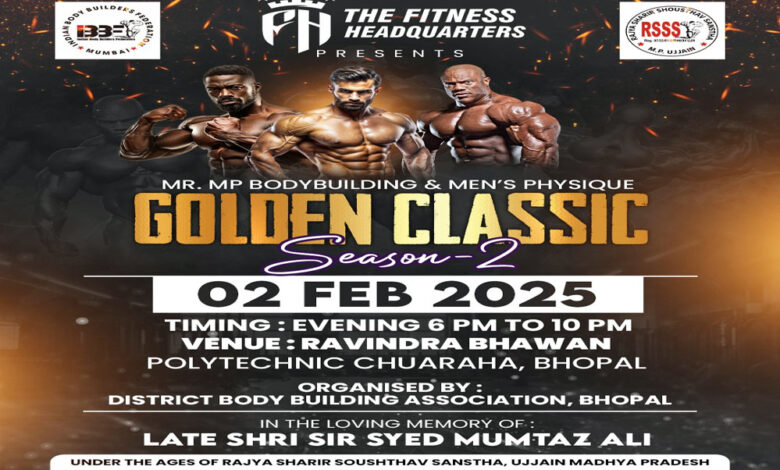 भोपाल जिला बॉडीबिल्डिंग संगठन द्वारा गोल्डन क्लासिक राज्य स्तरीय बॉडीबिल्डिंग एवं मेन फिजिक चैंपियनशिप का आयोजन रविवार 2 फरवरी 2025 को किया जा रहा हे l प्रतियोगिता की जानकारी देते हुए भोपाल बॉडीबिल्डिंग के प्रेसिडेंट राजेंद्र रावरिकर एवं कोषाध्यक्ष आशीष टॉक ने बताया की इस प्रतियोगिता में मध्य प्रदेश के विभिन्न जिलों से लगभग ढाई सौ खिलाड़ी प्रतिभागी होंगे प्रतियोगिता हेतु वजन प्रातः 9:30 से 12:30 बजे तक लिया जाएगा कार्यक्रम स्थल रविंद्र भवन पॉलिटेक्निक चौराहे के पास इस प्रतियोगिता में लगभग ढाई लाख रुपए नगद एवं आकर्षक ट्राफियां प्रदान की जाएगीl