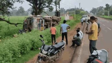 छत्तीसगढ़-पेंड्रा में अनियंत्रित ट्रक पलटा, ड्राइवर और कंडक्टर बाल-बाल बचे