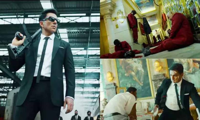 इसके बाद खून से सनी बॉडी को घसीटते हुए दिखाया जाता है, जिससे फर्श लाल हो जाती है। एक्टर इसमें एकदम सूट-बूट में नजर आ रहे हैं और सामने आदमियों की भीड़ को एक कमरे में धारदार हथियार से मार गिरा रहे हैं। किसी के सिर पर गोली मारते हैं तो किसी का चाकू से गला काटते हैं। नसीरुद्दीन शाह और विजय राज भी इसमें एक अहम किरदार निभाते दिखेाई दे रहे हैं। लेकिन सून सूद पूरे समय मारते दिखाई दे रहे हैं।