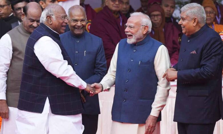 कांग्रेस अध्यक्ष मल्लिकार्जुन खरगे आमतौर पर पीएम मोदी की आलोचना करते नजर आते हैं। चुनावी रैलियों से लेकर संसद तक उनके निशाने पर प्रधानमंत्री रहते हैं। लेकिन शुक्रवार को पीएम मोदी के साथ खरगे एक अलग ही अंदाज में नजर आए। उन्होंने प्रधानमंत्री का हाथ अपने हाथों में पकड़ रखा था। उनकी बातें सुनकर पीएम मोदी हंस रहे थे। इस दौरान वहां पर लोकसभा अध्यक्ष ओम बिरला, उपराष्ट्रपति जगदीप धनखड़ और पूर्व राष्ट्रपति रामनाथ कोविंद समेत कई अन्य हस्तियां मौजूद थीं। मौका था डॉ. भीमराव अंबेडकर के 69वें परिनिर्वाण दिवस पर संसद भवन के लॉन में आयोजित श्रद्वांजलि कार्यक्रम का।