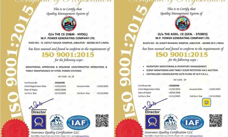पॉवर जनरेटिंग कंपनी जबलपुर के दो कार्यालयों को मिला आईएसओ 9001 सर्टिफिकेशन